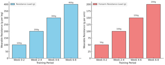 This study’s intervention was carried out from October to December, within the competitive season. During this period, the intervention group wore WR sleeves (Lila™, Kuala Lumpur, Malaisia) on their calves (Figure 1). The resistance was introduced progressively, starting with 100 g per leg and increasing by 100 g every two weeks, reaching 400 g per leg by the end of the intervention (Figure 2). This corresponded to ~0.15%, 0.30%, 0.45%, and 0.60% of body mass, based on the average participant body mass (66.8 ± 6.9 kg). The control group served as an active control group, wearing the WR sleeves (Lila™) on their forearms (Figure 1) to ensure a comparable external load without directly affecting lower-limb mechanics. The active control group started with 50 g per arm and increased by 50 g every two weeks, reaching 200 g per arm by the end (Figure 2). This approach helped match the total external load between groups, while isolating the specific effects of lower-limb WR in the intervention group. This gradual progression was implemented to minimize injury risk and ensure safe adaptation, which was particularly important given the in-season context where maintaining peak performance was a priority. The final load corresponded to less than 2% of body mass, which is well within the range typically applied in WR studies (0.3–8.5% BM) without adverse effects [9,10].