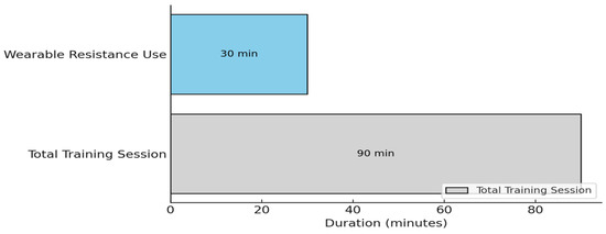 To ensure fairness in use of the WR, all players used it for only 30 min during each training session (Figure 3). This specific duration was chosen as it took place where all players, regardless of position, participated in the same warm-up drills and general training exercises. Allowing players to wear resistance throughout the entire session would have introduced variability in training load, as offensive players (e.g., hitters) typically perform more jumps and 10 high-intensity actions compared to defensive players (e.g., liberos). By limiting resistance use to a standardized and position-neutral part of practice, the intervention ensured that all participants received a comparable training stimulus.