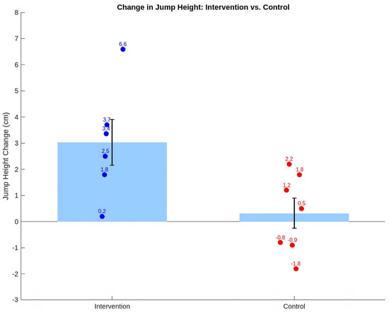 A significant main effect of time was found (F = 10.76, p = 0.007), showing that participants jumped higher in the post-test compared to the pre-test. A significant group × time interaction was also observed (F = 6.97, p = 0.023), indicating that the improvement differed between groups. Because of the small and uneven group sizes, a Welch’s t-test was used to compare the change in jump height between the groups. This revealed a significant difference (t = 2.57, p = 0.031, d = 1.59), showing that the intervention group improved their CMJ more than the control group. The mean improvement in jump height was 5.13 ± 3.52 cm for the intervention group and 2.39 ± 1.52 cm for the control group. The estimated effect size (Cohen’s d) was 1.04, indicating a large effect of the intervention (Figure 4 and Figure 5).