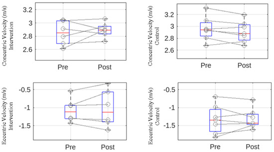 Pre- and post-intervention eccentric and concentric phase velocities for the intervention (WR) and control groups. Boxplots show the distribution, and lines represent individual participants.