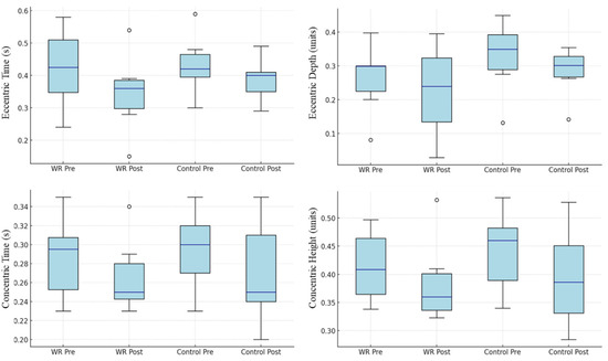 Pre- and post-intervention values for eccentric time, eccentric depth, concentric time, and concentric height in the intervention group (WR) and control group.