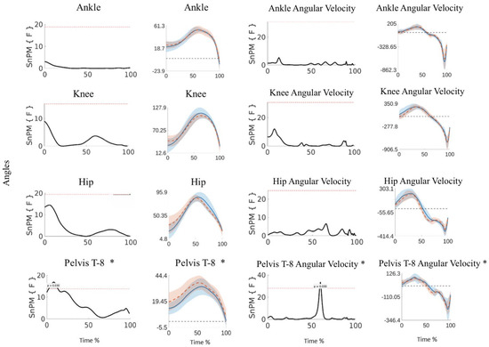 Statistical Parametric Mapping ANOVA results for Joint Angles and angular velocity of the right Ankle, Knee, Hip, and Pelvis (T8) in the control group. * indicates a significant difference between pre- and post-test (p = 0.030). Pre-test (dashed red) post-test (solid blue).