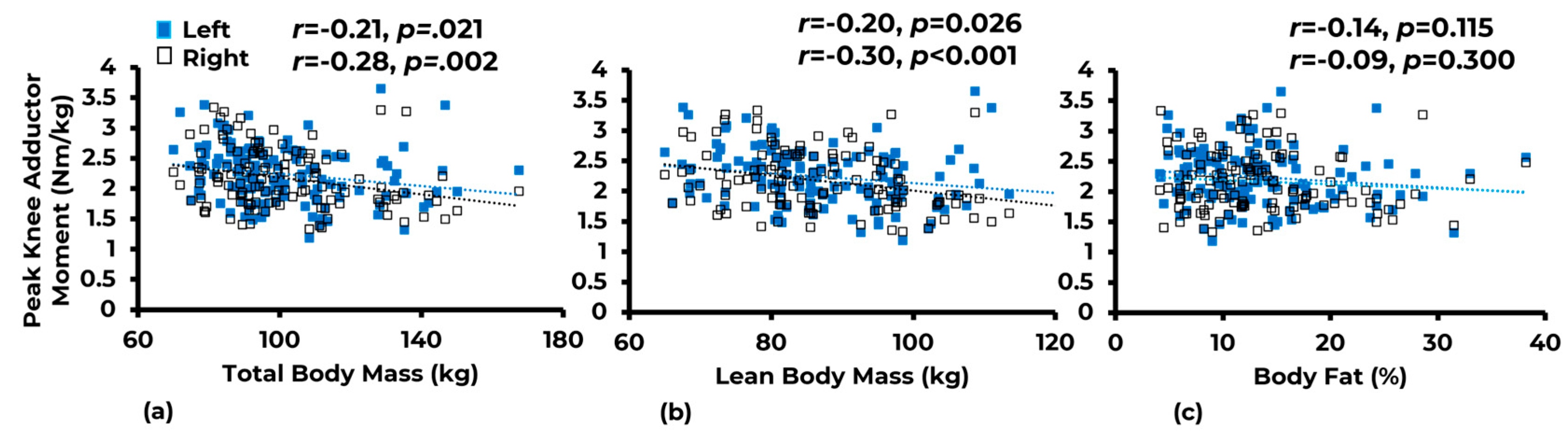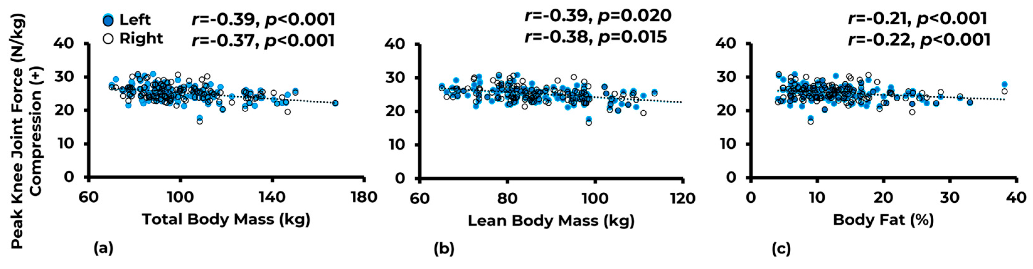 - Harding, G.T.; Dunbar, M.J.; Hubley-Kozey, C.L.; Stanish, W.D.; Astephen Wilson, J.L. Obesity is associated with higher absolute tibiofemoral contact and muscle forces during gait with and without knee osteoarthritis. Clin. Biomech. 2016, 31, 79–86. [Google Scholar] [CrossRef]
