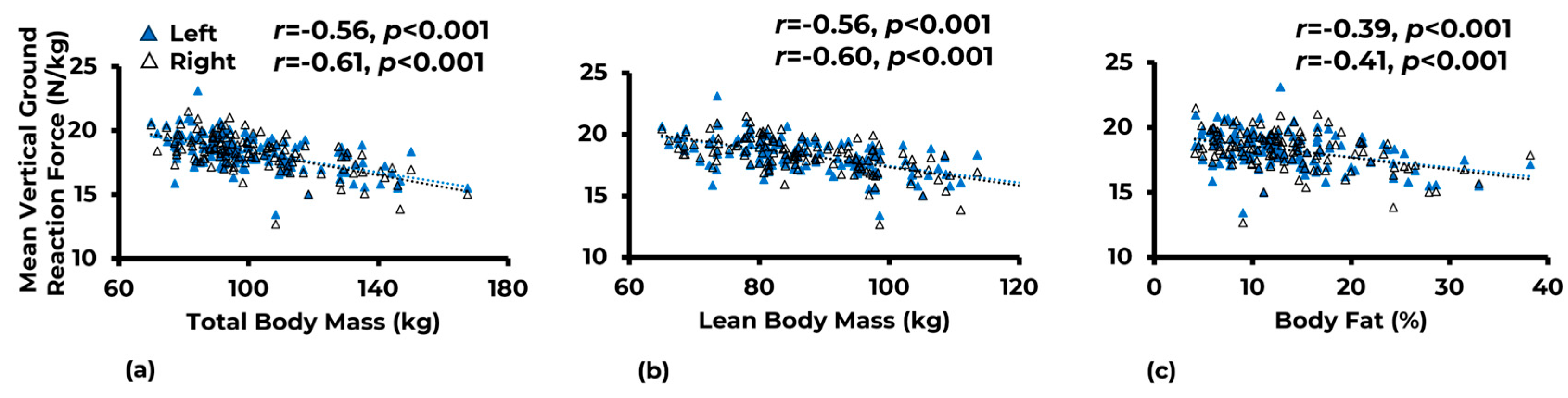 - Vincent, H.K.; Kilgore, J.E., III; Chen, C.; Bruner, M.; Horodyski, M.; Vincent, K.R. Impact of body mass index on biomechanics of recreational runners. Phys. Med. Rehabil. 2020, 12, 1106–1112. [Google Scholar] [CrossRef] [PubMed]