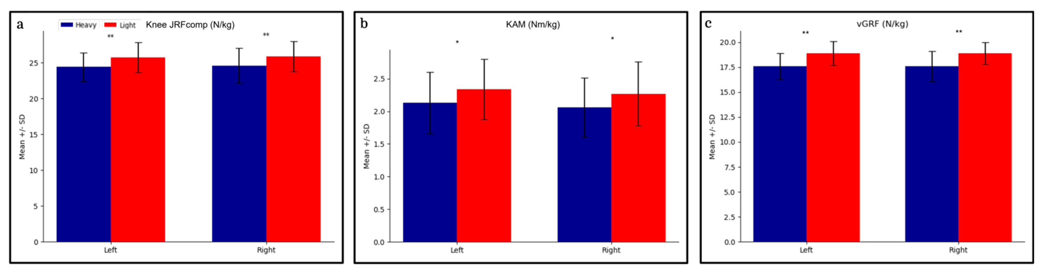 Joint reaction force | Left | −0.39 ** | −0.39 * | −0.21 ** |