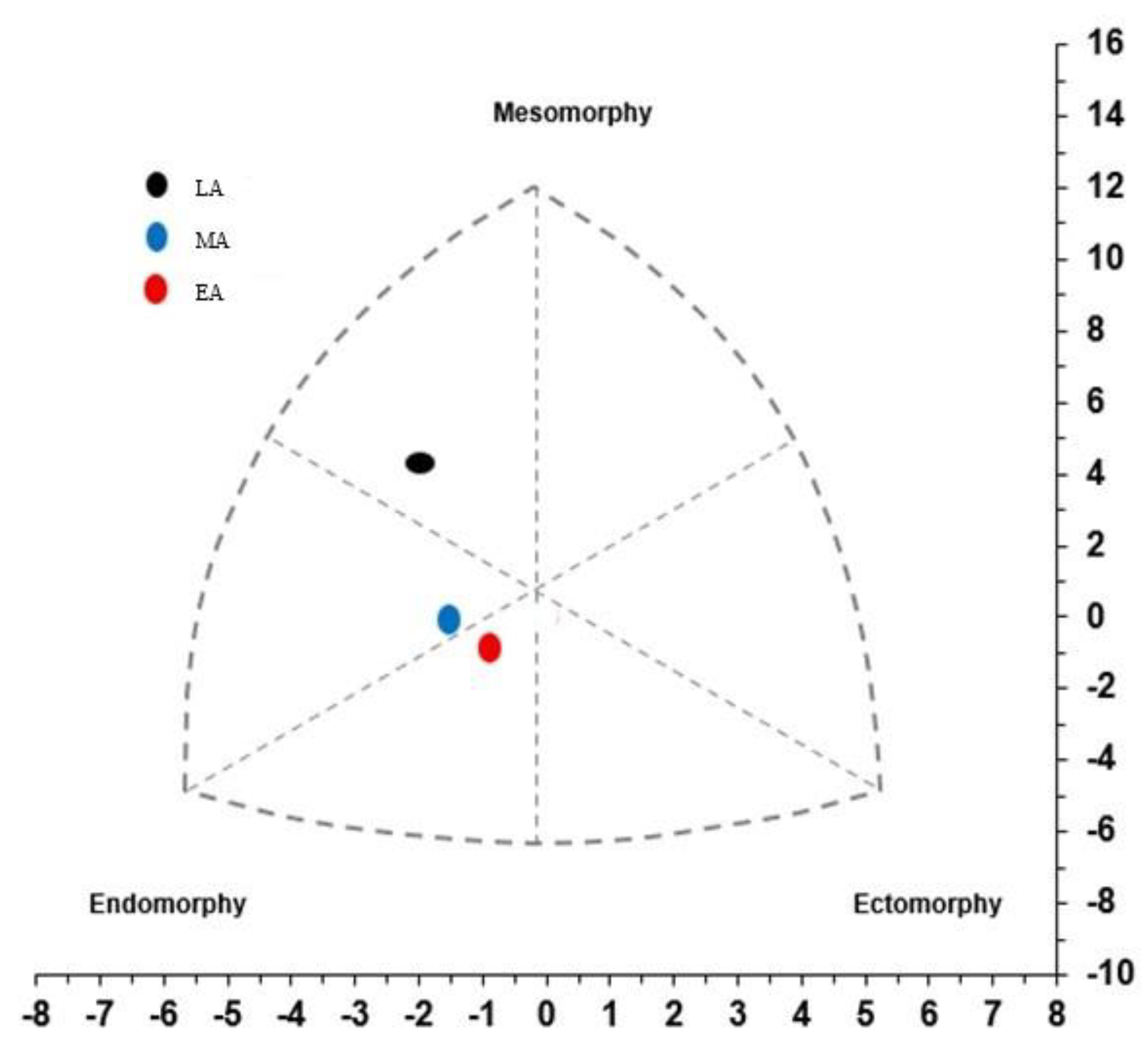 - Heath, B.H.; Carter, J.E.L. A modified somatotype method. Am. J. Phys. Anthropol. 1967, 27, 57–74. [Google Scholar] [CrossRef] [PubMed]