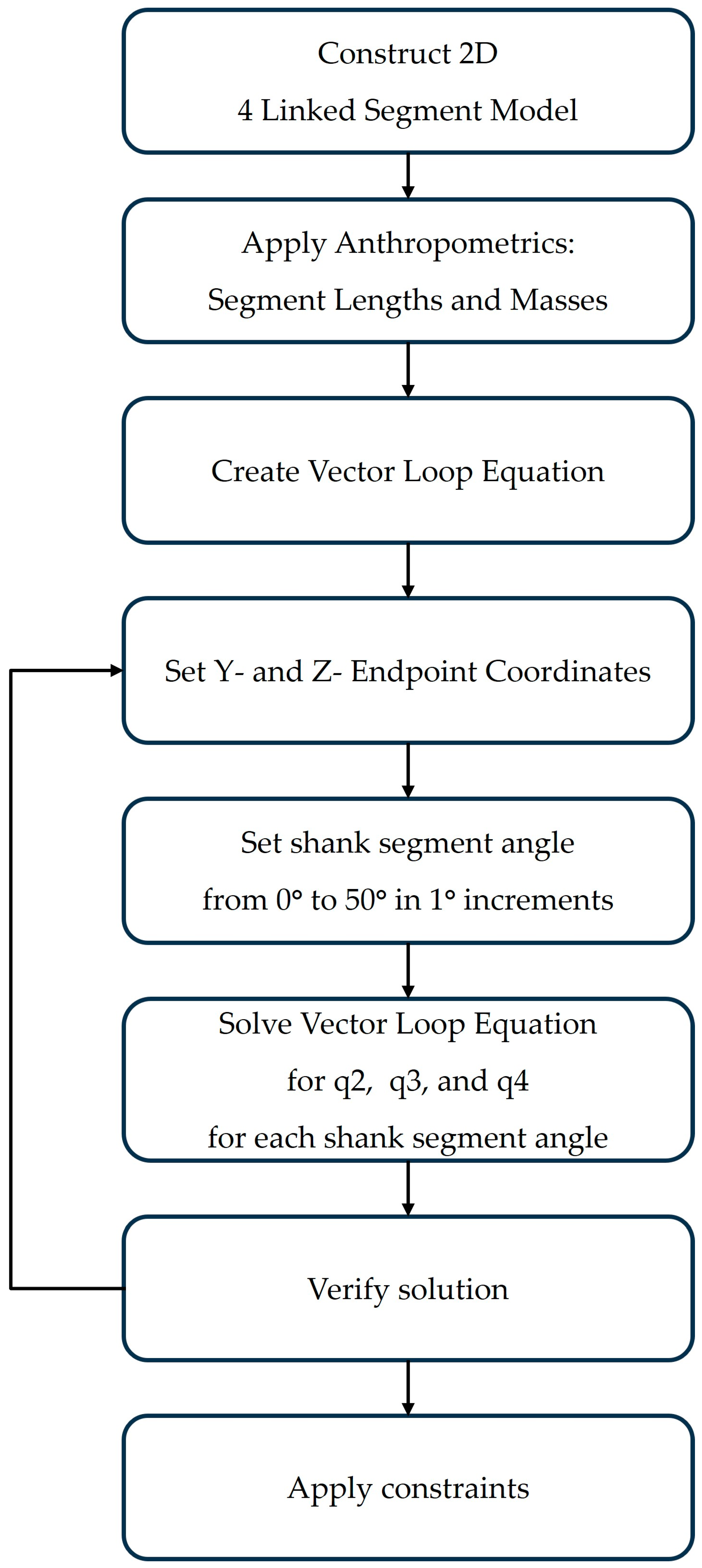 31]. The vector loop equation was set to zero. The shank segmental angle was the driver segment for the simulations and varied from 90° to 40° from the positive Y- (horizontal) axis, in increments of 1°. This corresponded to anatomical ankle dorsiflexion angles from 0° to 50°.
