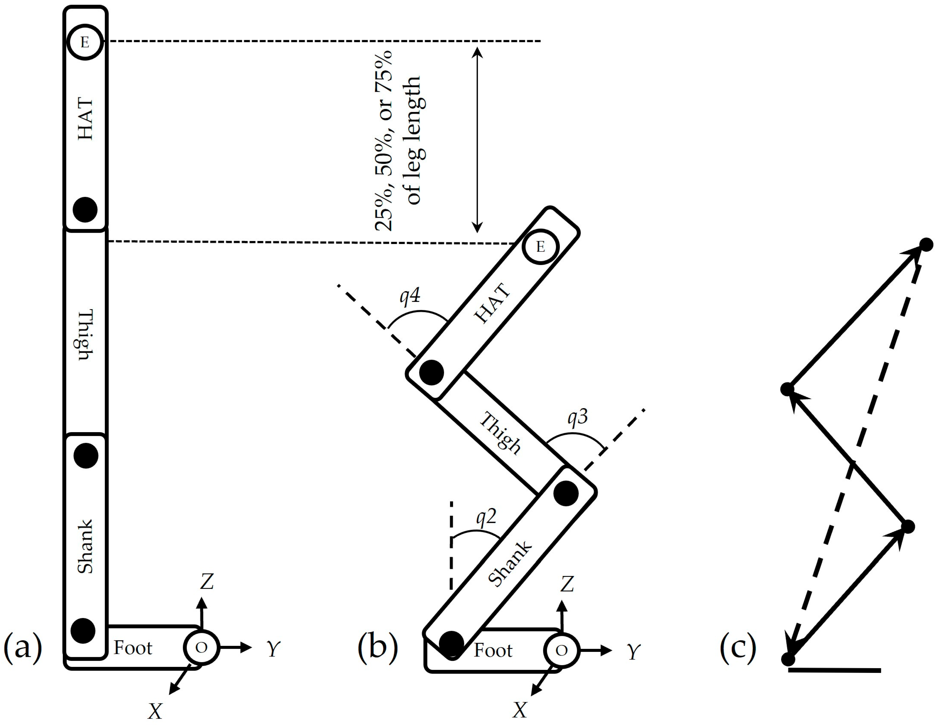 Figure 1. I modeled the body as a serial chain of four rigid bodies (foot, shank, thigh, and head, arms, and trunk (HAT)) attached by revolute joints (ankle, knee, and hip) with a single degree of freedom for each joint in the sagittal plane (about the X–axis) using MotionGenesis software (Motion Genesis, Menlo Park, CA, USA). The origin of the chain was the distal end of the foot (representing the metatarsophalangeal joint) and the endpoint of the chain was the acromion process (see
