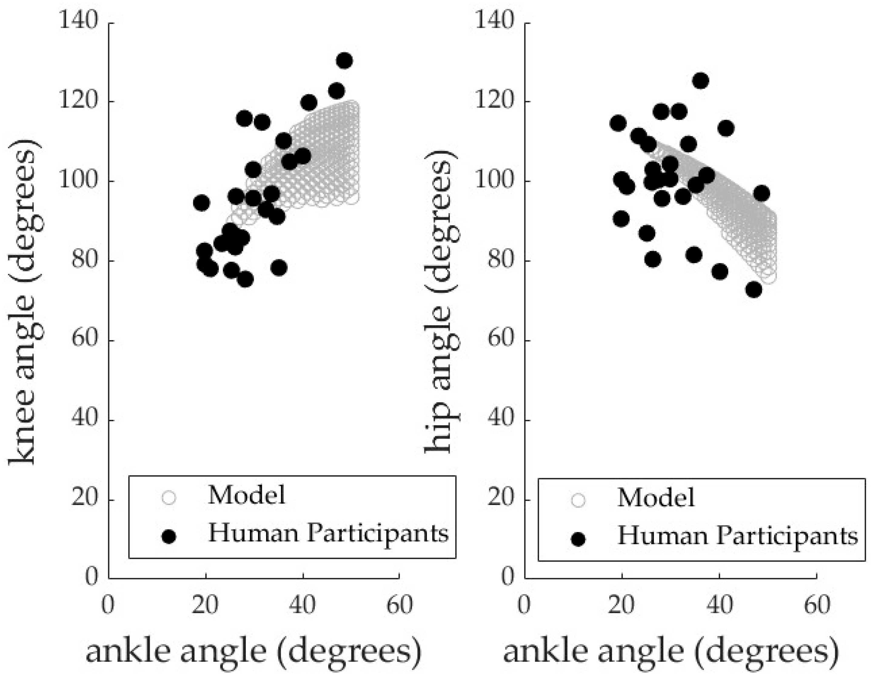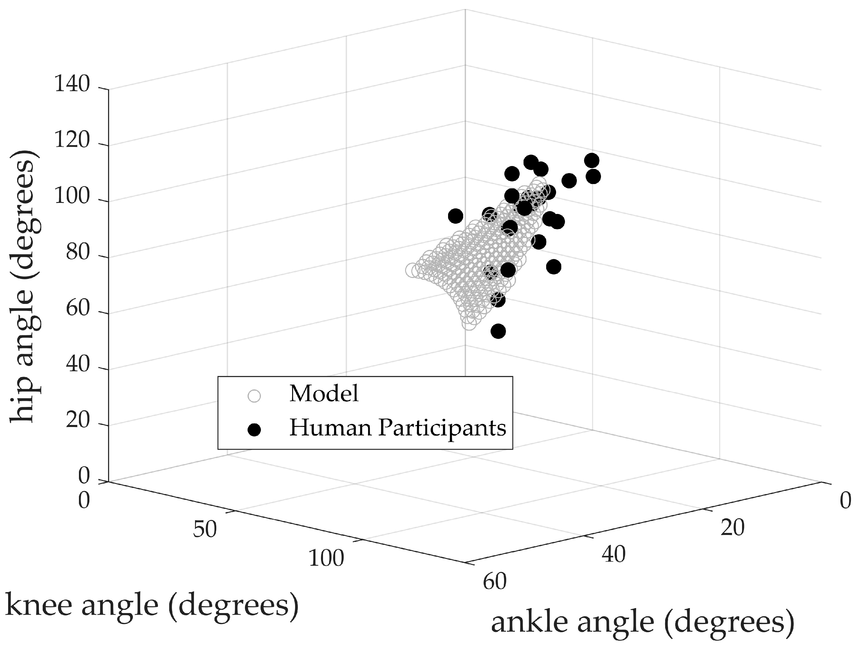 The model did represent a reasonable approximation to human participants’ data, but with a smaller range of values for the hip and knee angle. While participants were required to squat to 50% of their leg length, they did not achieve exactly 50% (as the model did) because the model had a higher degree of precision than did laboratory measurements. This may have been a result of inherent human variability on the part of the investigator as well as the participants. There may have been slight measurement errors, participants may have deflected the elastic band at the bottom, and/or there could have been issues with using the plastic dowel. Additionally, as the forward model would predict some of the participants’ endpoint would be posterior to the ankle joint center, it is reasonable to assume that some of the participants may have flexed their spine or had out-of-plane movement at the hip or ankle complex. Additionally, the constraints imposed on the model were stricter than those placed on the participants. Yet, the average of all of the participants matched that of model.