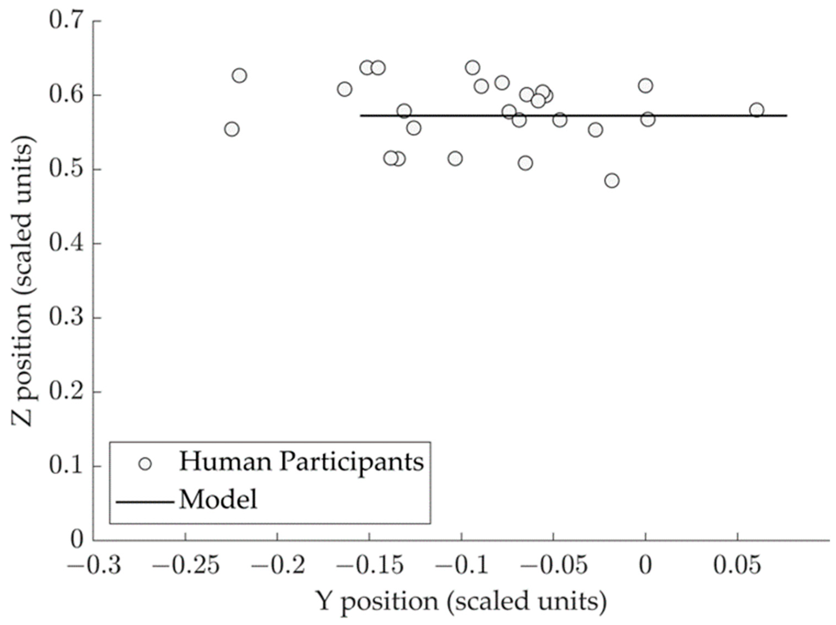 For the first simulation, I used male anthropometrics and a depth equal to 25% of leg length. I chose a target location for the endpoint, which represented the acromion process. The initial Z- (vertical) coordinate was to a depth of 25% of leg length (standing position −25% of leg length) to simulate landing from a jump (