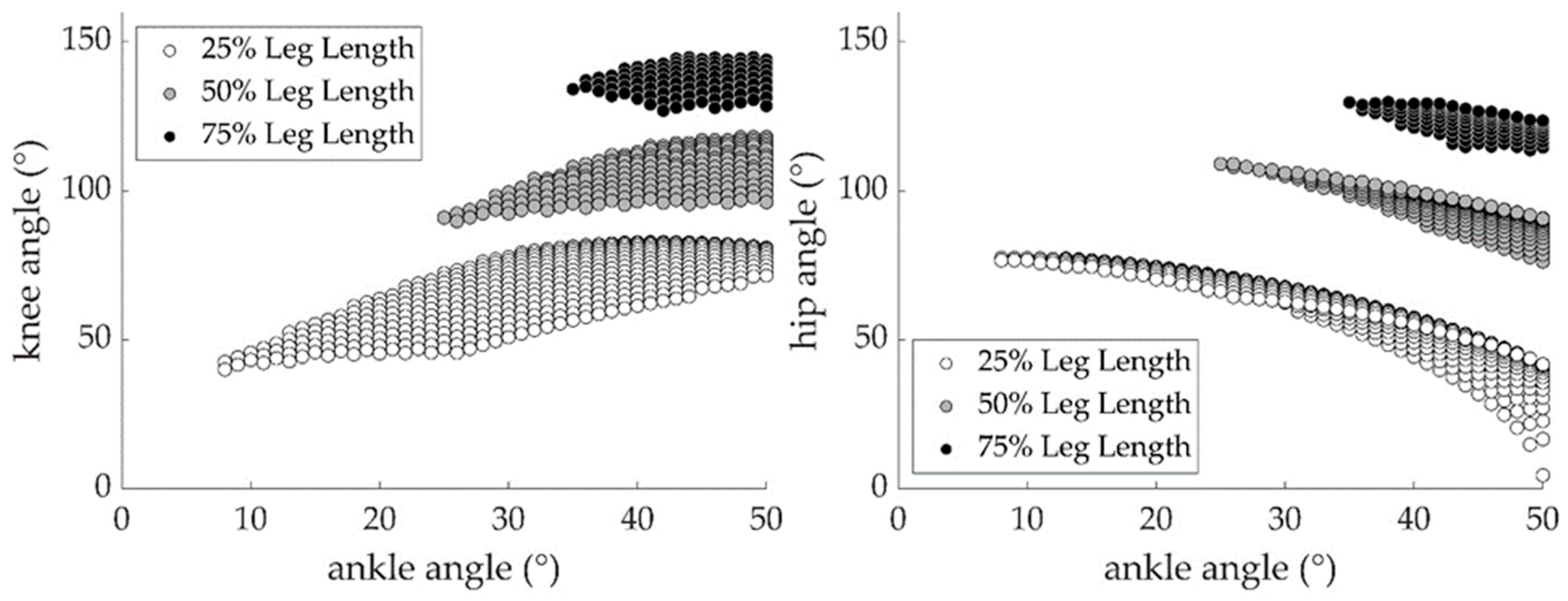 33]. The decision to drive the shank angle by 1° increments was an arbitrary one. If the increments changed to 0.5° then the solution space would have doubled. If the increments changed to 2°, then the solution space would have been halved. However, the total range of motion would be minimally affected. Therefore, the relative change in the size of the solution space is more important than the actual change in the solution space.