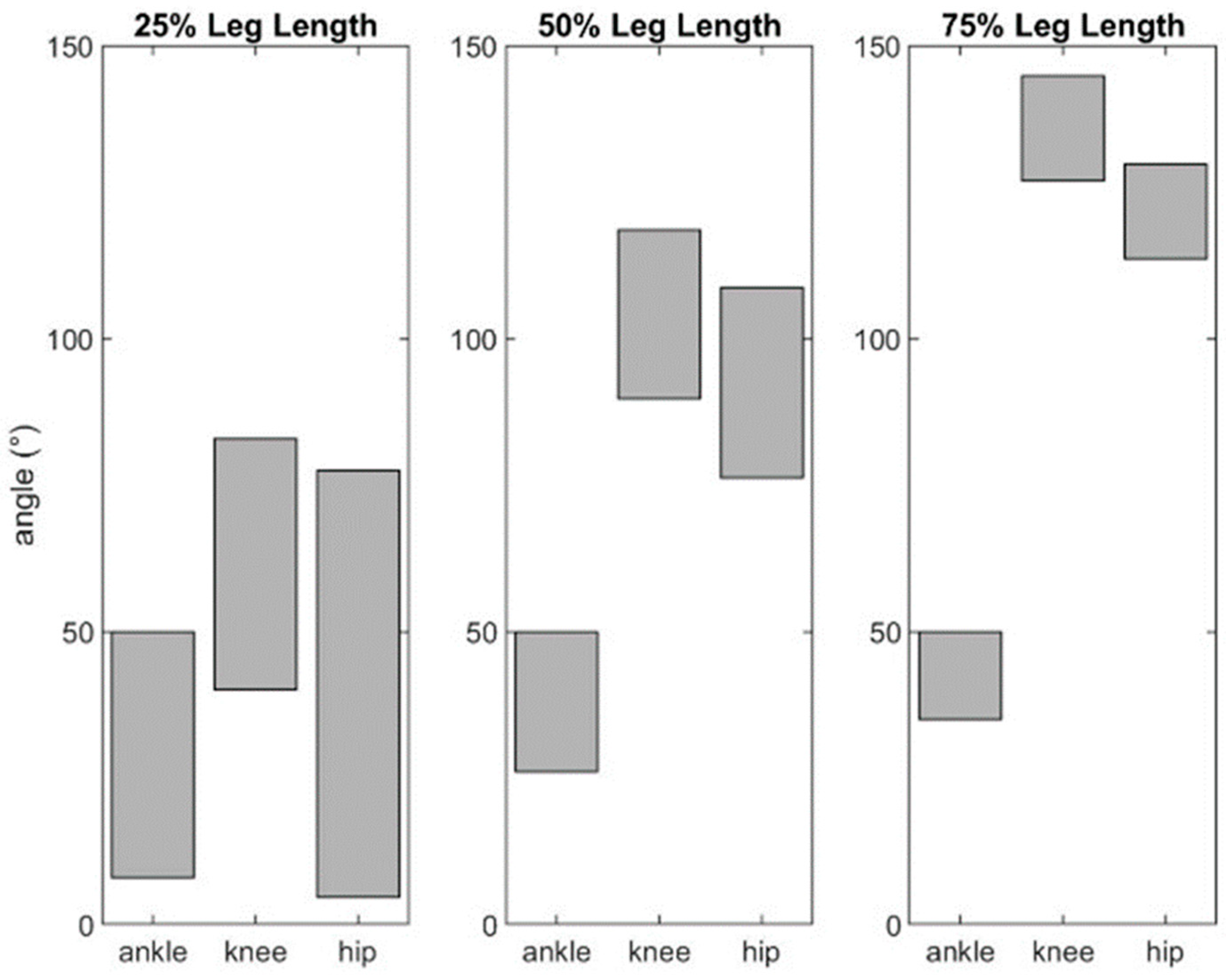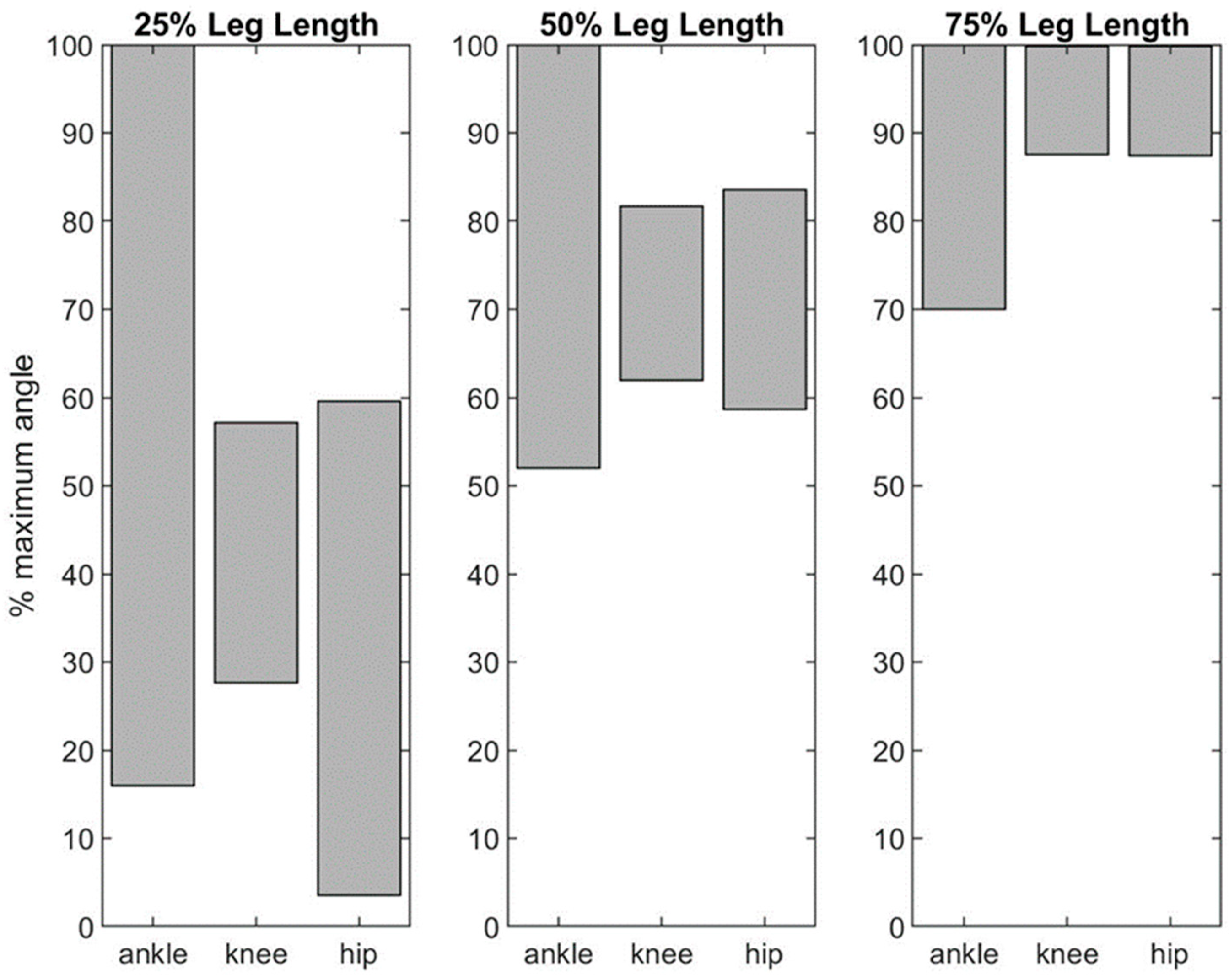 Table 2). One may argue that is more likely to have decreased ROM at the ankle compared to the other joints, and that cannot be determined by these simulations. The percentages of maximum angle were the largest at the ankle for the 25% and 50% leg length depths, but were equally high for all 3 joints at the 75% leg length depth (