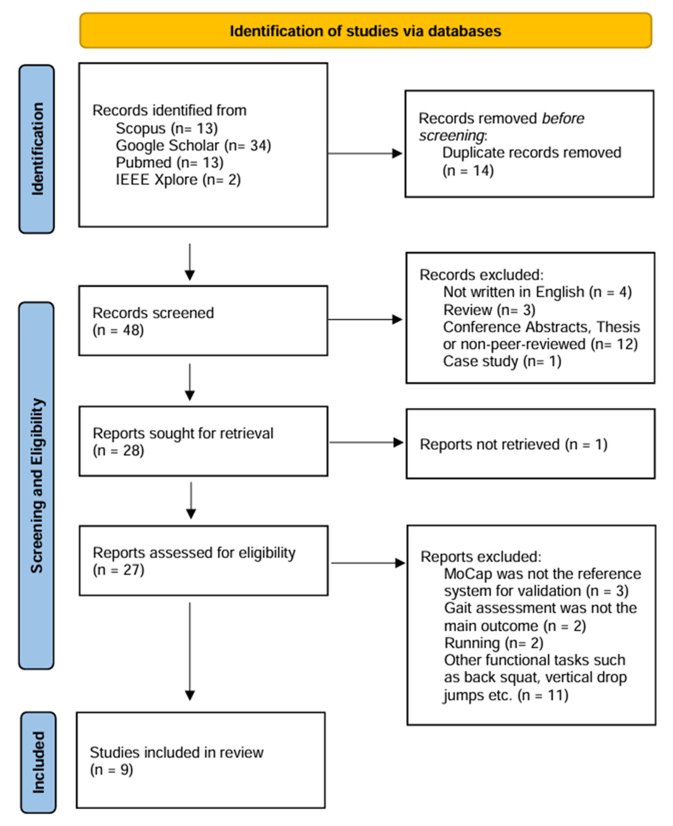 | Svetek et al. 2024, USA [62] | Total: 20 athletes (ice hockey), 21.35 ± 1.3 yrs, M: 2/F: 18 | 10-camera MoCap (Vicon, Oxford, UK) at 240 Hz | 37 retro-reflective markers, custom placement | 2 iOS devices (iPad Air) | 45° off center of the walking path, tripod-mounted | Gait analysis on a treadmill; healthy gait and other functional tasks | Peak joint angles in sagittal and frontal planes (hip, knee) | Validation |