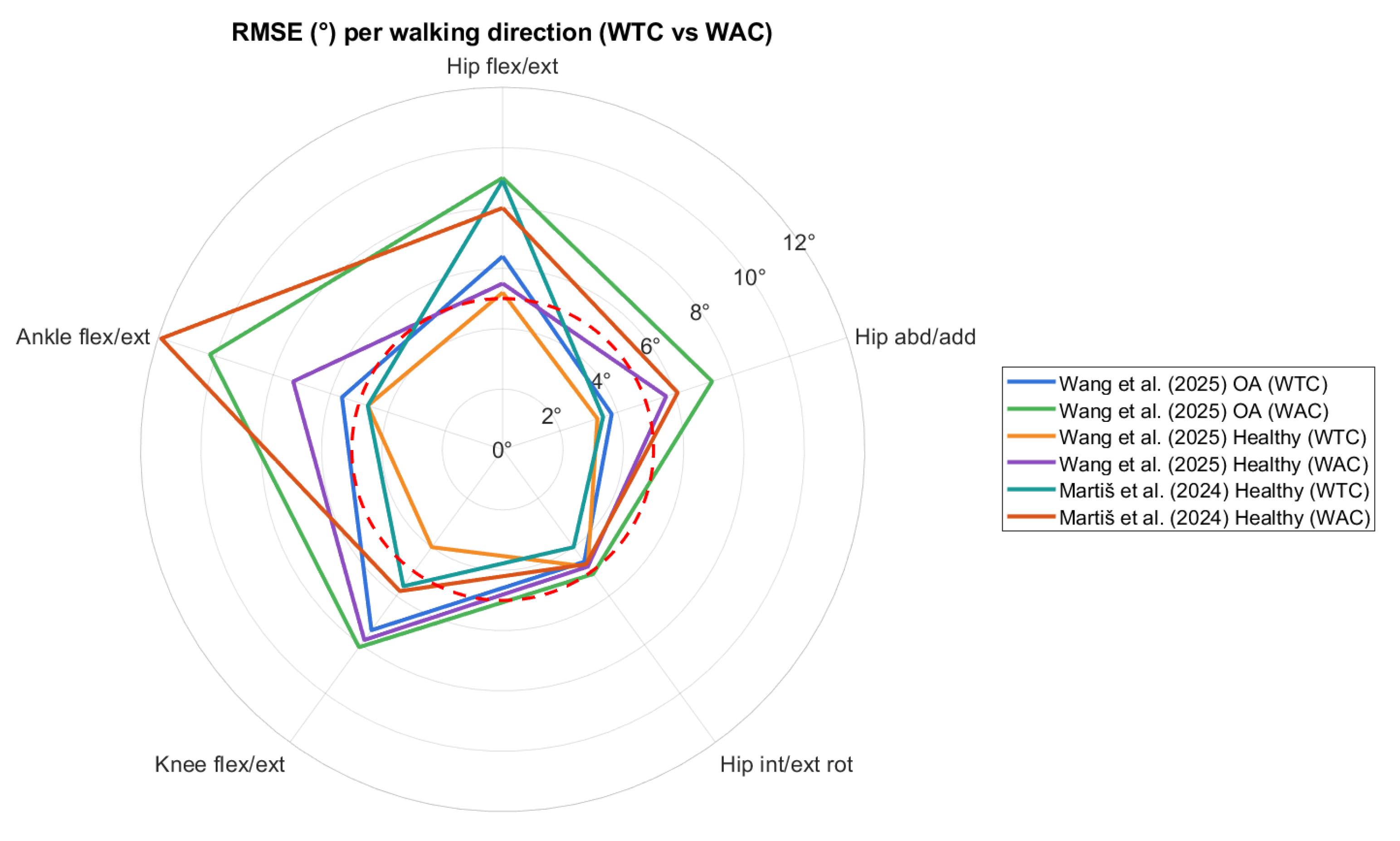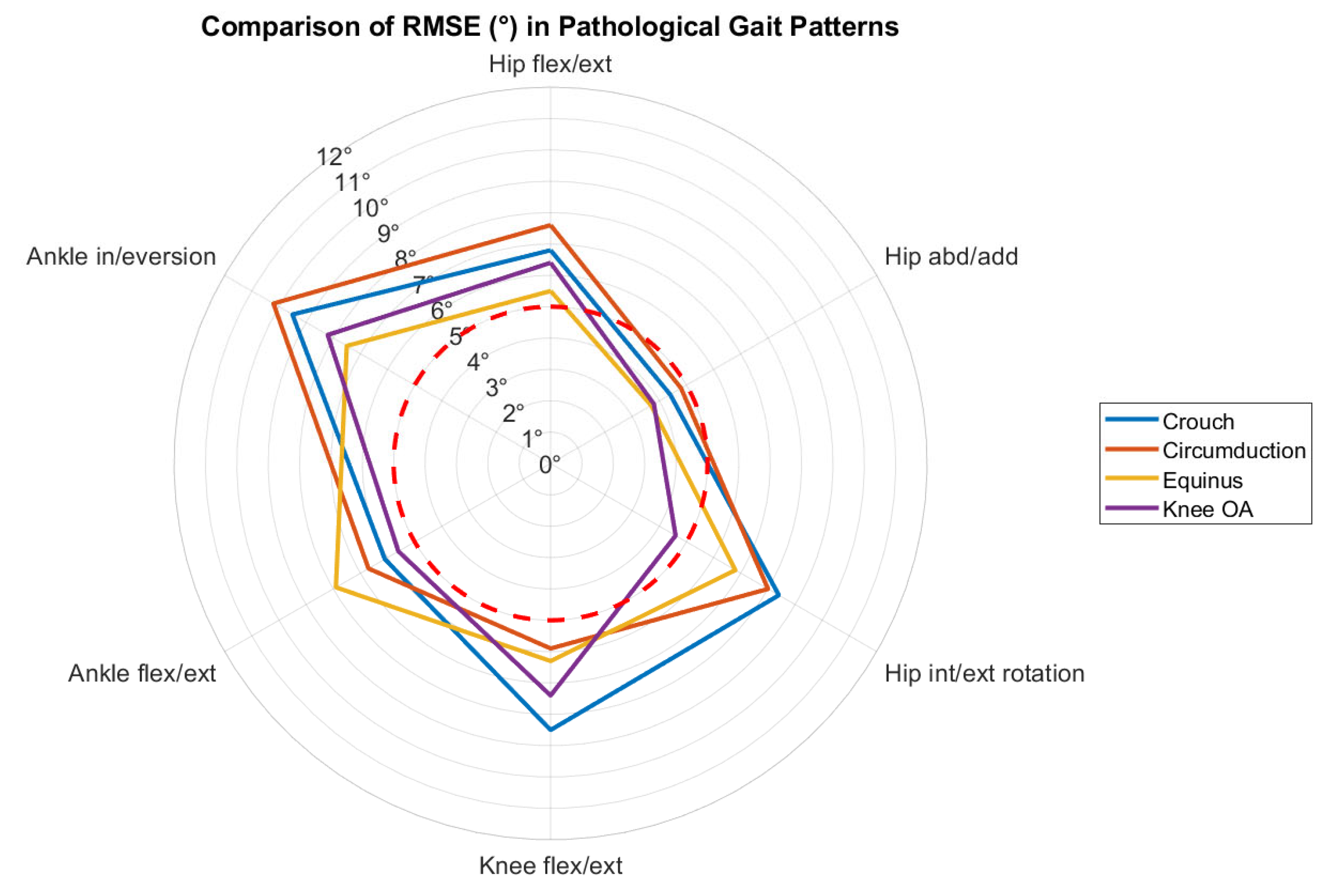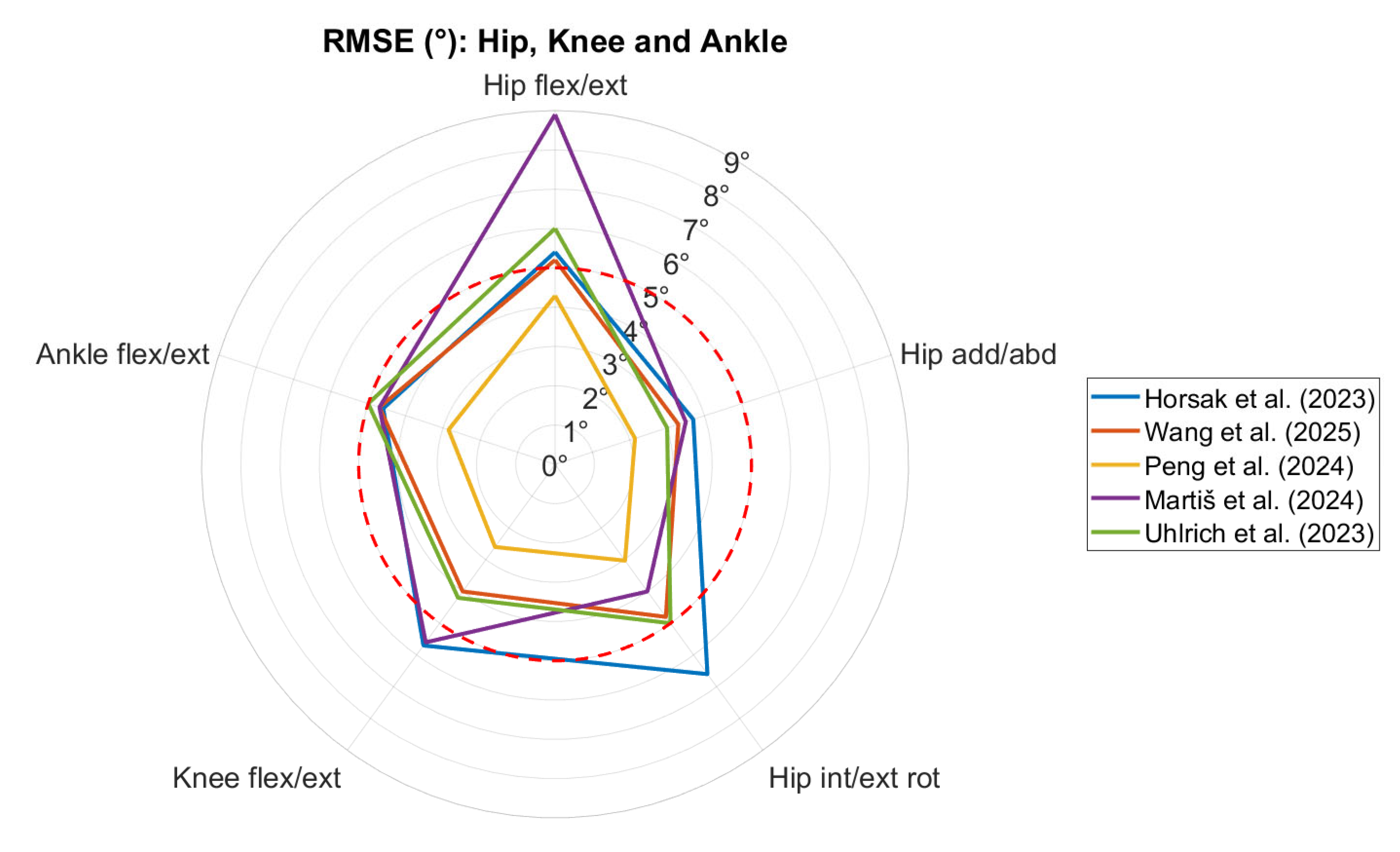 | Wang et al. 2025, China [65] | Total: 83 individuals, 53 patients with knee osteoarthritis (64.5 ± 6.5 yrs, 42M/11F), 30 healthy individuals (55.2 ± 3.3 yrs, 25M/5F) | 10-camera MoCap (Vicon, Oxford, UK) at 150 Hz + 2 force plates at 1200 Hz | 34 retro-reflective markers, custom placement | 2 iPhones (12 Pro) | 35° off center of the walking path, 1.3 m from ground, tripod-mounted | Gait analysis on a 7 m walkway, pathological and healthy gait toward and away from camera | Lower-limb joint kinematics (pelvis, hip, knee, ankle) | Validation and Characterization |