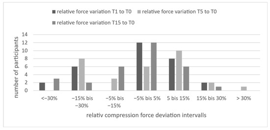 Distribution of participants according to relative deviation in reproduced compression force at T1, T5, and T15 compared to the initial force (T0), categorized in seven deviation intervals. Most values lie within ±15%, indicating high reproducibility of proprioceptively recalled force over time.