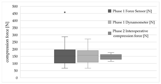 Boxplot comparison of compression forces measured in Phase 1 (via force sensor and dynamometer) and Phase 2 (intraoperative application). The grey dot indicates an outlier value outside 1.5 times the interquartile range.
