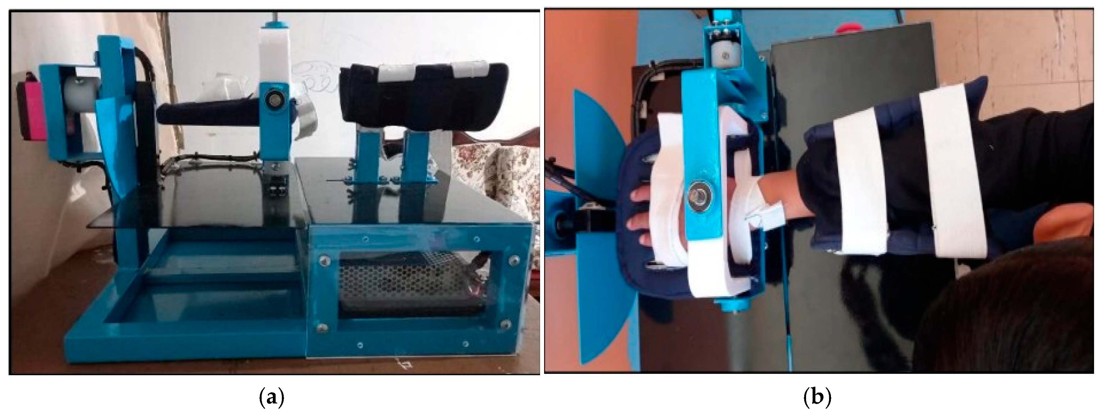 Our device offers several advantages over existing rehabilitation equipment. The construction cost of approximately USD 3200 was found to be significantly lower than imported devices, which can reach USD 25,000, making it more accessible for healthcare facilities in Ecuador. The device’s adjustable design accommodates wrist circumferences from 10 to 16 cm and forearm lengths from 15 to 25 cm, covering the anthropometric range of children aged 6–12 years, as validated in this study, and the settings can be modified for each child’s needs by therapists through the computer interface. Therapy standardization is facilitated by the provision of consistent, controlled movements at safe speeds, while additional time is provided for therapists to focus on other treatment aspects.