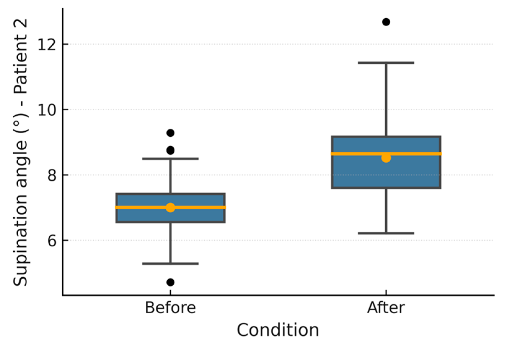 Figure 11 show box plots visualizing the wrist mobility angles (flexion, extension, ulnar deviation, radial deviation, and supination) of each patient before and after the sessions with the device. After using the prototype, Patient 1′s median flexion went from 37.60° to 40.68° and Patient 2′s median flexion went from 32.49° to 33.87°. The extension went from −33.80° to −30.36° and from 2.11° to 3.84°; the ulnar deviation went from 12.97° to 14.26° and from 8.02° to 9.53°; the radial deviation went from 2.47° to 3.77° and from 5.01° to 6.15°; and the supination went from 9.41° to 11.04° and from 7.07° to 8.44°. In addition, in all cases, the interquartile range after treatment was slightly lower, which means that the device had a more consistent effect and that the extreme outliers that had been present in the prior phase were no longer there. These changes in the graphs support the statistically significant gains observed using the Wilcoxon test (