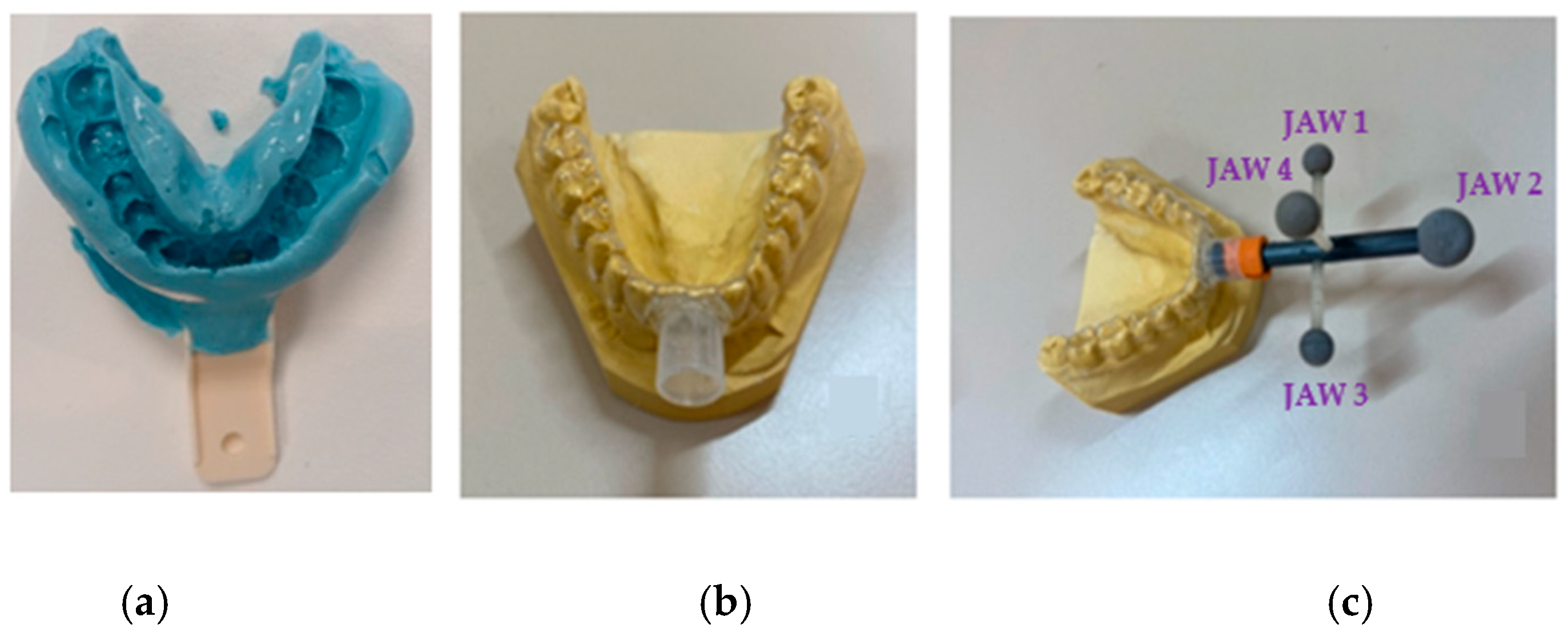 (a) Dental arch print in alginate; (b) personalized dental splint on the plaster model (the splint is transparent and covers the entire dental arch to ensure stability); (c) personalized dental splint with the jaw cluster fixed on it.