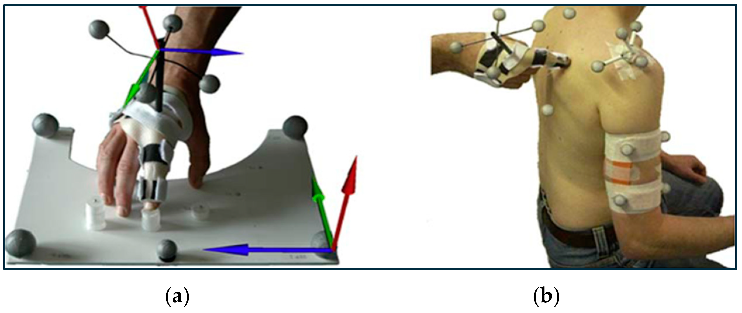 (a) Gantlet and finger pulp calibration. The arrows define the anatomical frames of the A-Palp and the calibration board.; (b) AL static calibration (20).