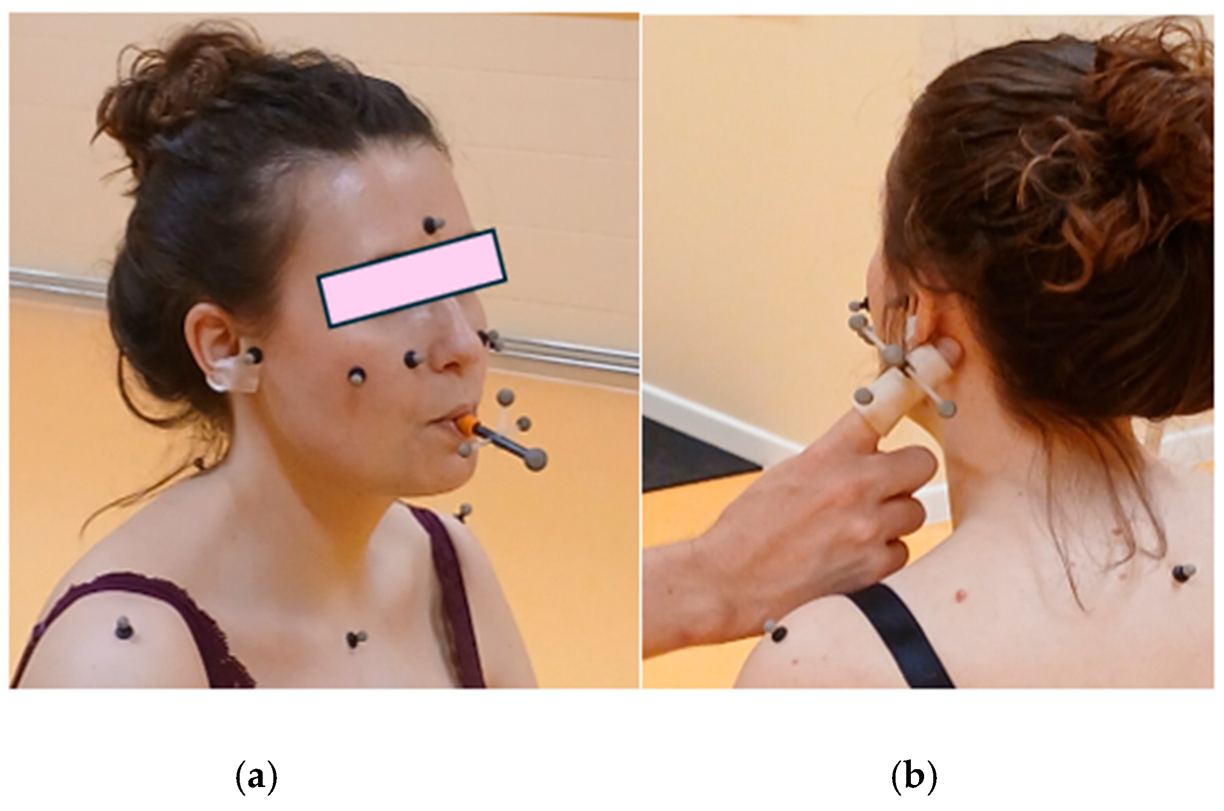 (a) Subject sitting straight on the stool, looking forward, with the personalized dental splint in the mouth and self-reflecting markers on Als. (b) Examiner performing palpation with the A-Palp on 5 supplementary Anatomical Landmarks, here the left mastoid process.