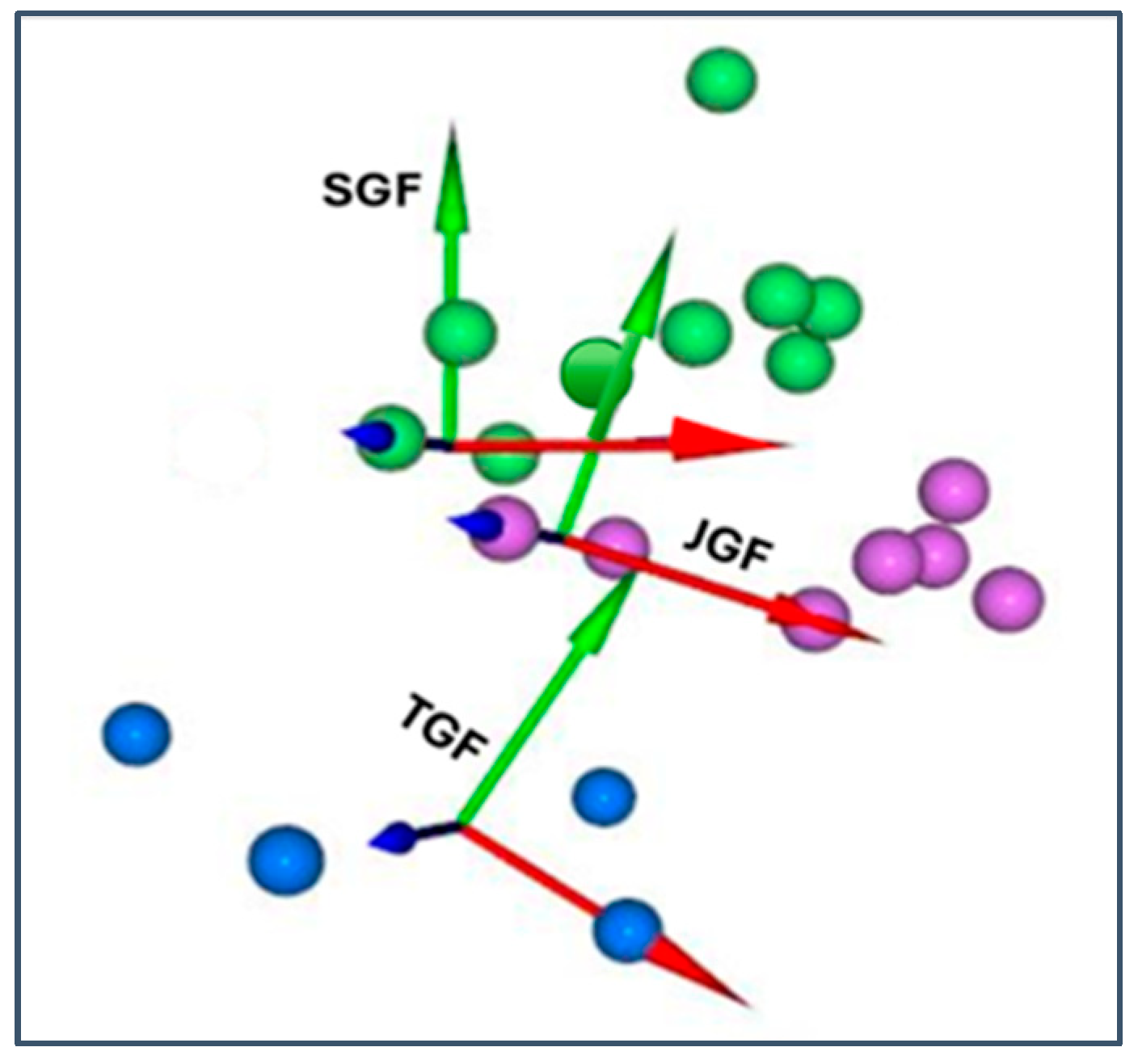 Screen shot of a right lateral view of the ALs and AFs built in LhpFusionBox. Green balls: skull Anatomical Landmarks (ALs), SGF: Skull Global Frame. Purple balls: jaw ALs, JGF: Jaw Global Frame. Blue balls: thorax ALs, TGF: Thorax Global Frame.