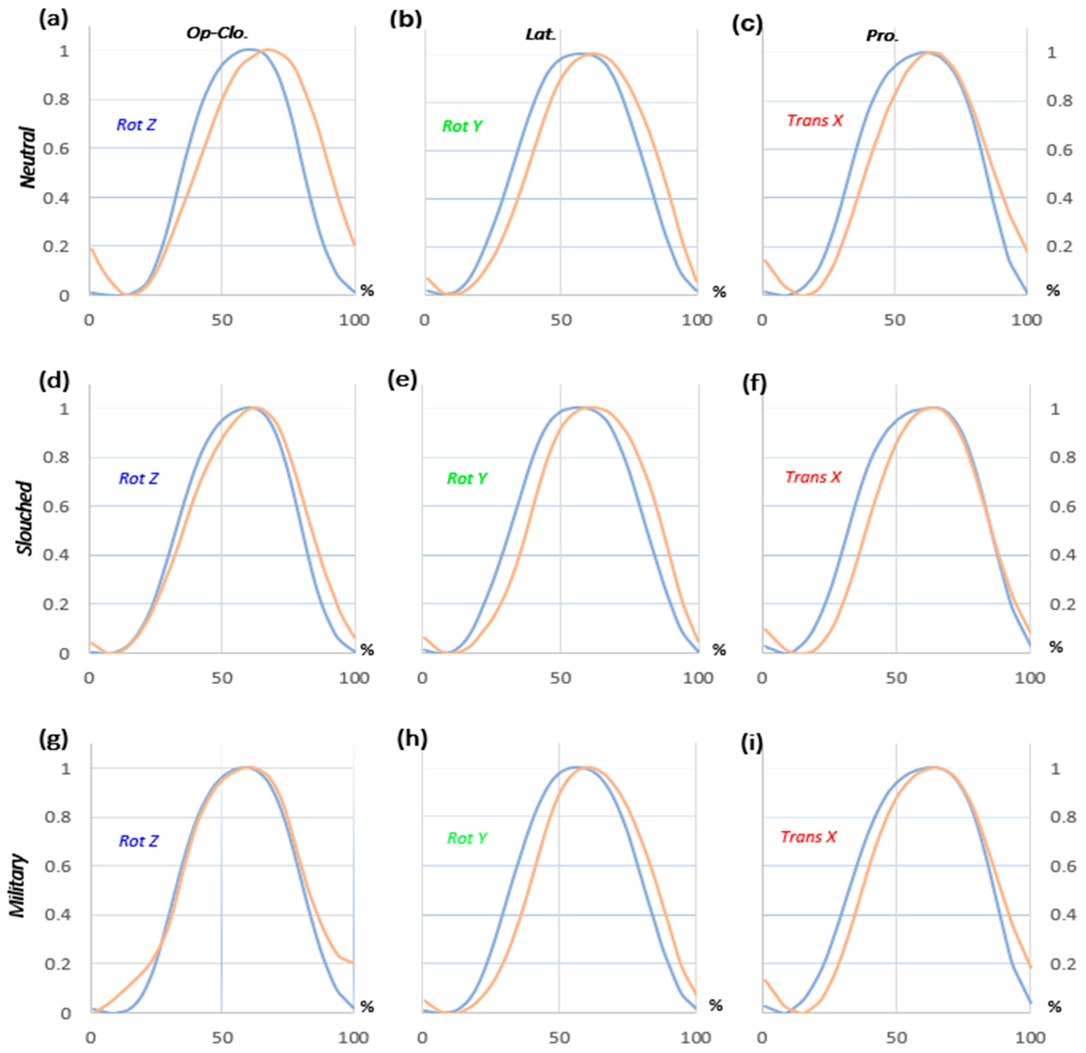 Graphs of the normalized amplitudes (between 0 and 1) of the jaw (—) and the skull (—). Amplitude of rotation around the Z-axis during the mouth opening–closing motion cycle for the neutral (a), slouched (d) and military positions (g). Amplitude of rotation around Y-axis during the laterotrusion motion cycle for the neutral (b), slouched (e) and military positions (h). Amplitude of translations on X-axis during the protrusion motion cycle for the neutral (c), slouched (f) and military positions (i).