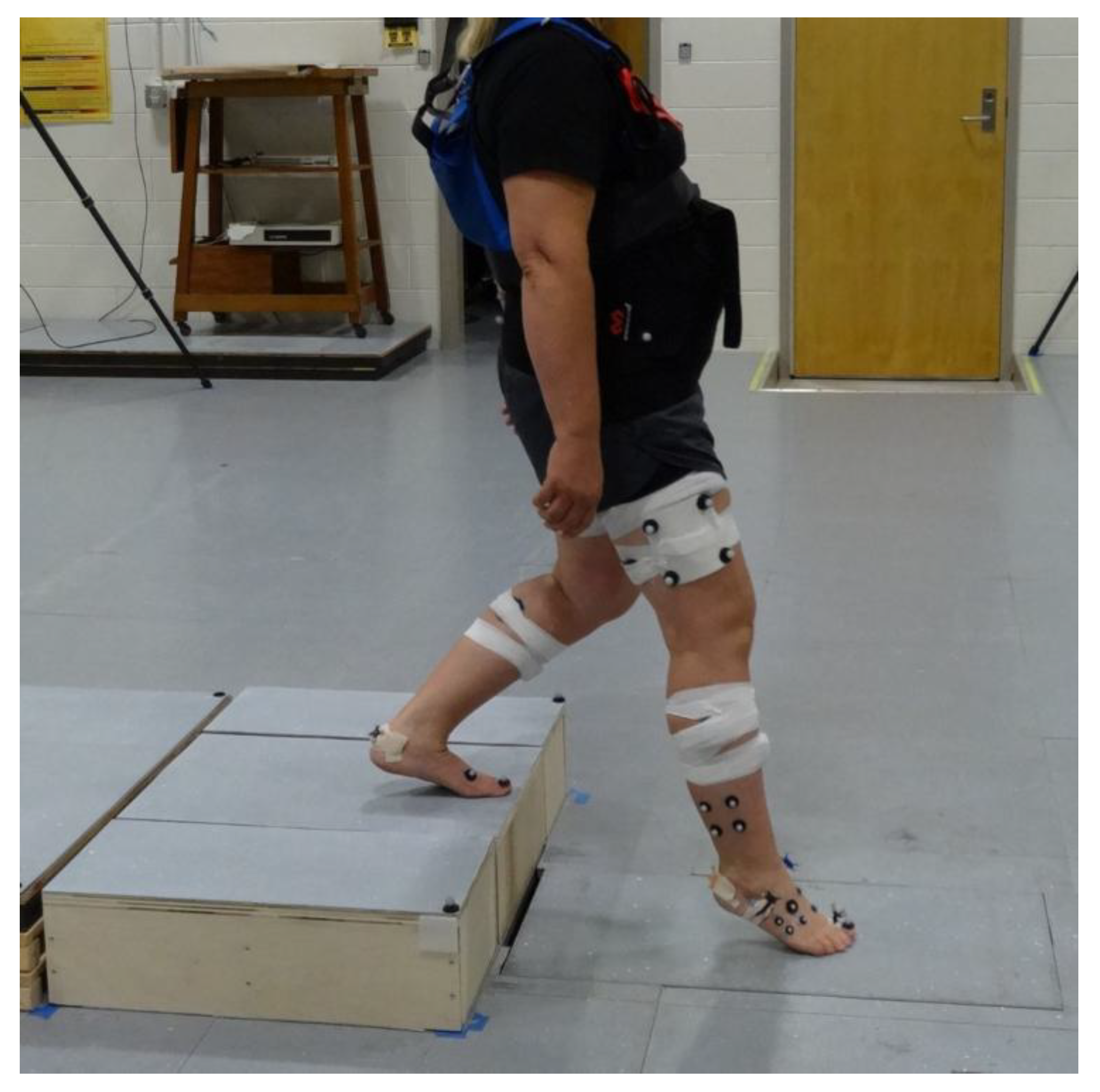 - Gerstle, E.E.; O’Connor, K.; Keenan, K.G.; Slavens, B.A.; Cobb, S.C. The Influence of Women’s Age and Fall History on Foot and Lower Limb Kinematics during Transition Step Descent. J. Biomech. 2024, 166, 112056. [Google Scholar] [CrossRef]