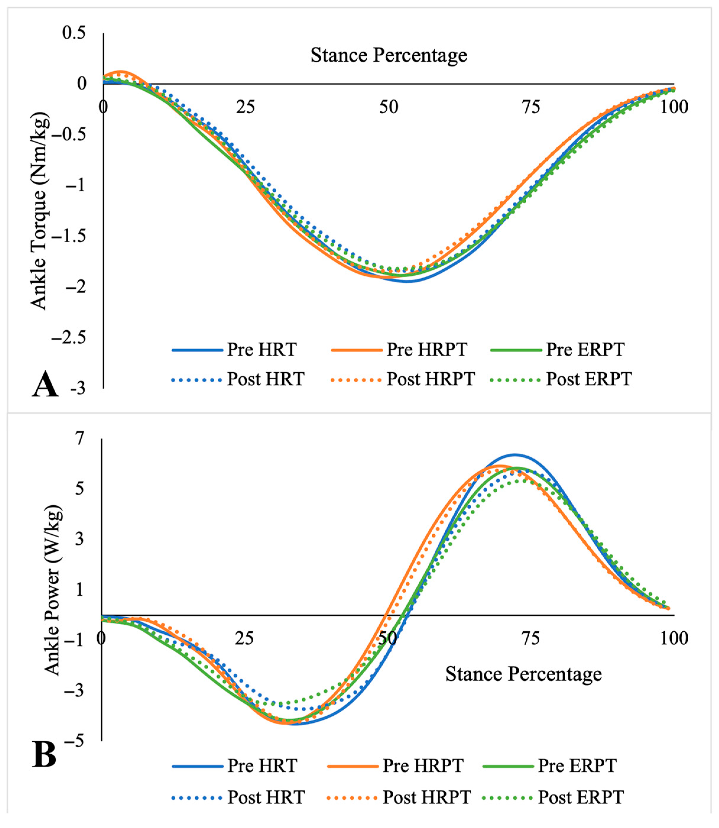 | Peak Ankle Positive Power | 6.49 ± 1.83 | 6.41 ± 1.63 | 6.20 ± 1.65 | 6.17 ± 1.41 | 5.97 ± 2.59 | 6.27 ± 2.53 | 0.75 | 0.93 | 0.69 |