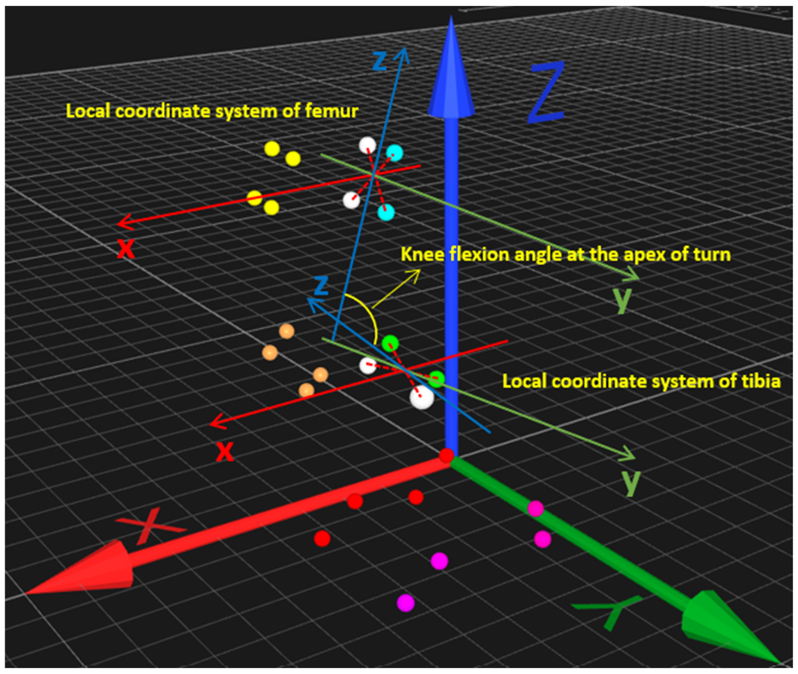 Markers used for angle calculation were placed approximately parallel to the anatomical axes of the thigh and shank segments. The absolute values were calculated based on the reference values. For each measurement, the zero value of knee flexion was defined in full extension and flexion of the lower limb or prosthesis before the start of each measurement. The primary outcome variable was the absolute value of knee flexion at the apex of each turn derived from the angle between both local coordinate systems (the tibial and femoral axes, see
