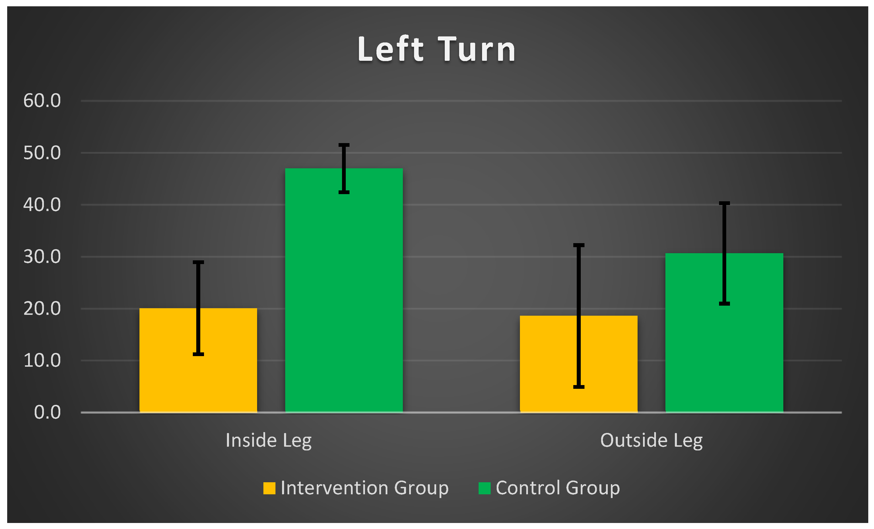 Table 5 contains the mean values with standard deviations, minimum and maximum values, and confidence intervals for both groups, both experimental scenarios (left and right turns), and both limbs.