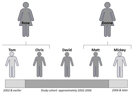 The initial model was tested using data from an original research study. A qualitative study investigated the experience of children living, playing, and exploring Raleigh, NC (n = 5; n = 3 boys and n = 2 parents) between 2002 and 2006 while they attended a local elementary school. The researcher became aware of the activity from a YouTube video [] that Donna, a parent in the study, created to present at a conference. After contacting Donna, a snowball sampling technique was utilized to recruit participants; in snowball sampling, an insider or initial participant facilitates recruiting future participants []. The sample represented a chronological account of the activity, and the names of research participants were changed (see Figure 1). Chris had an older brother who played at the creek after school. Matt had a younger brother who played in the creek with the study cohort but could not find peers interested in playing in the creek once his brother graduated from elementary school. Chris, Matt, and their mothers were interviewed about the experience of the boys’ siblings to document the uniqueness of the boys’ experience at the creek.