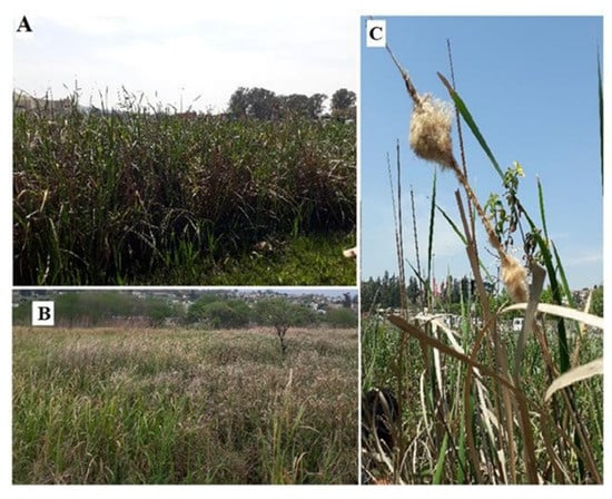 (A) Greater Edendale Wetland (rehabilitated wetland), (B) Willow fountain wetland (natural wetland) and (C) Typha Capensis, one of the two dominant wetland vegetation species.