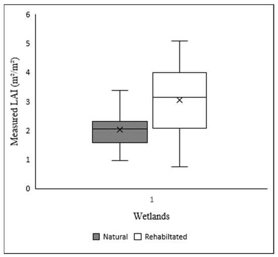 Box plots of LAI, where the grey box represents the natural wetland and the white box represents the rehabilitated wetland.