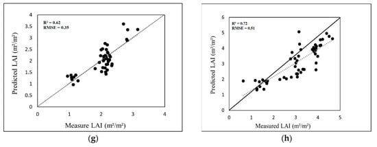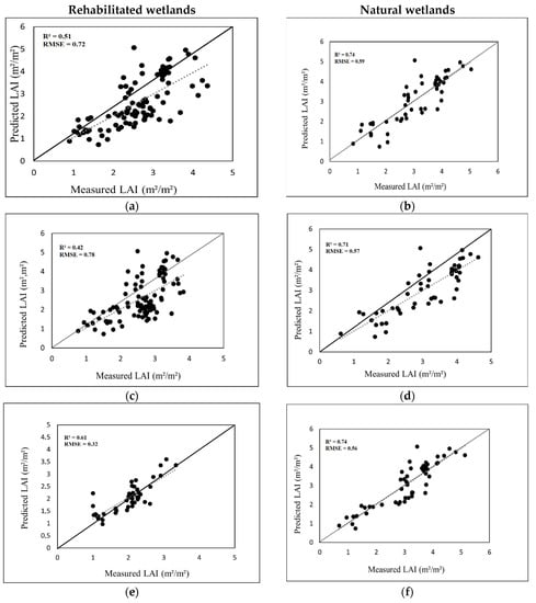LAI estimation accuracies improved with the use of nDVI and sR vegetation indices, as compared to the accuracies derived from using standard bands only. A RMSE of 0.32 m2/m2 and an R2 of 0.61 were attained for sR vegetation indices whereas, a RMSE of 0.34 m2/m2 and an R2 of 0.62 were obtained from nDVI (Figure 4). Therefore, nDVI vegetation indices were outperformed by sR vegetation indices in the natural wetland. However, for the rehabilitated wetland, results show improved accuracies in LAI estimations for wetland vegetation with the use of nDVI vegetation indices. A RMSE of 0.51 m2/m2 and an R2 of 0.72 were obtained for nDVI vegetation indices and an RMSE of 0.56 m2/m2 and an R2 of 0.74 was attained for sR vegetation indices. The selected optimal variables for the natural wetland were vegetation indices that were a combination of the green, red, red-edge and NIR/SWIR bands. However, for the rehabilitated wetland, some of the optimal vegetation indices included the blue band, red-edge bands and bands from the NIR sections of the electromagnetic spectrum.