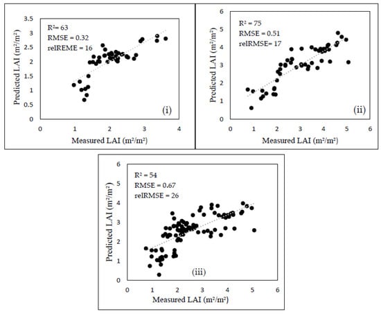 The process of model validation refers to assessing the performance of a model under realistic conditions using independent data []. Leave-one-out cross-validation (LOOCV) was therefore completed on a selected measured dataset to evaluate the performance of the PLSR model. Cross-validation (CV) has been proven as a useful method in prediction error estimation []. It is an unbiased and commonly used method to determine the optimal number of components to take into account []. CV splits data into training and testing data. Research conducted on plant biophysical data often uses LOOCV as a validation method []. The LOOCV coefficient of determination (R²), root mean square error (RMSE) and relative root mean square error of prediction (relRMSE) of the regression were used to generate the goodness of fit for all of the models, and these were computed to assess and compare the LAI estimation models across both wetlands. The models representing the measured and predicted LAI were compared for both wetland types. The most optimal model was represented by the lowest RMSE and relRMSE. This indicated that the model performed better than the other models.