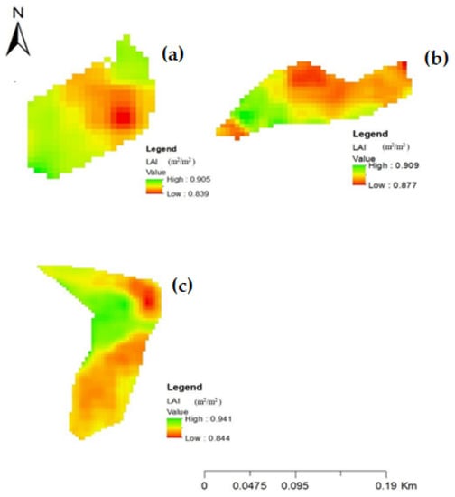 The spatial distribution of LAI for natural wetlands (a) and (b) as well as rehabilitated wetland (c).