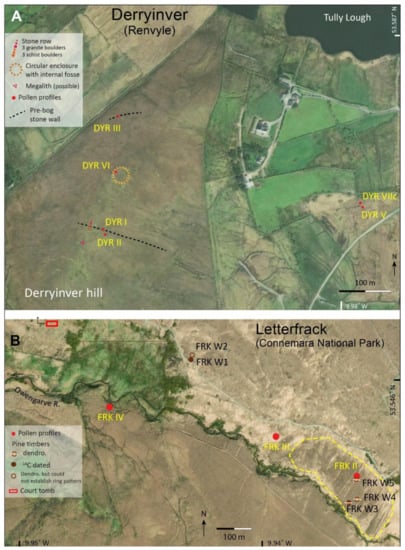 | DYR VI: peat-filled ditch in enclosure; ps: 26; 14C: 2; span: 3.2–0.09 ka 53.58471, −9.98664; 78 m asl; Figure 2A | * [24]; [10] |