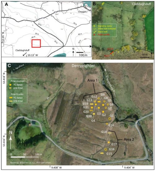 | CLD I: blanket peat and underlying mineral soil, beneath stone wall; ps: 17; 14C: 2; span: 4.9–2.9 ka 53.54895, −10.12698; 38 m asl; Figure 3A,B | * [24] |