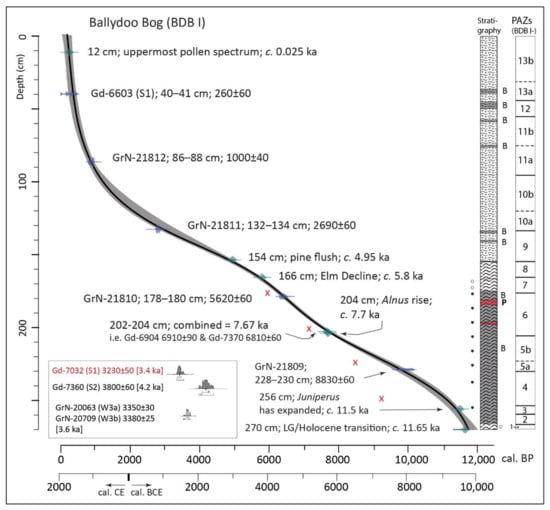 | BDB I (peat): ps: 88 + 4 sps; 14C: 12 (4); span: 11.7–0.23 ka 53.53383, −9.46091; 32 m asl; Figure 1C | * [11,30], * [31]; presented in detail |