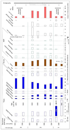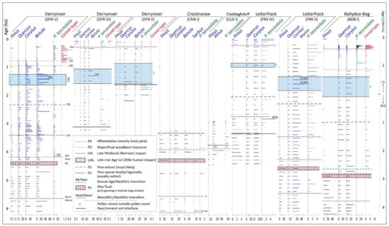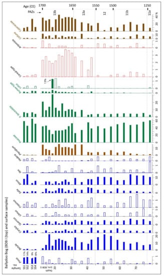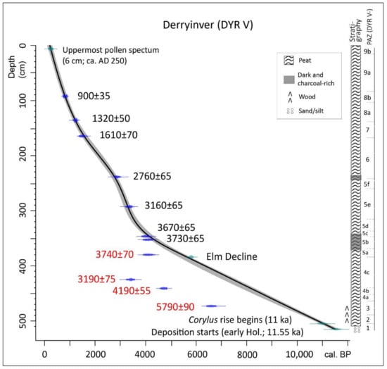 | DYR V: peat profile beside hill; ps: 136; 14C: 11 (4); span: 11.5–0.25 ka 53.58407, −9.97903; 30 m asl; Figure 2A | * [24,25]; [9]; presented in detail |