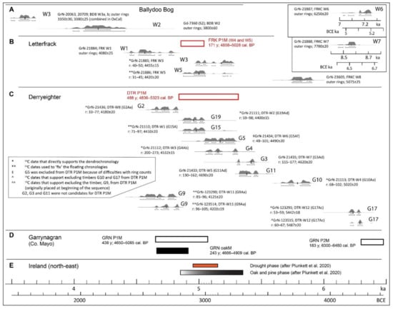 | Derryeighter, eastern Connemara (14C dating and pine dendrochronology;Figure 3C) | |