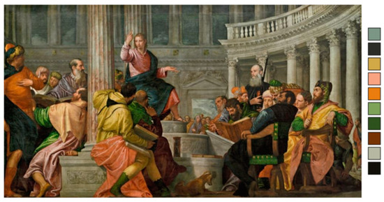 The first map printed by copper plate engraving, the map of the Mediterranean (Figure 4, adapted from [34]) by the Italian cartographer and engraver Paolo Forlani, was published in 1569. A portolan, but without following the previous structure and content of the maps of this category where color is used to represent political or geographical divisions and the corresponding pictorial symbols that prevailed in the previous two centuries have been eliminated. The countries and the continents are depicted by the inscription of their name, with color along the inner side of the coastline of some of them and by coloring their interior with a lighter color tone. The sea background is covered by sparse tiny black dots, but the coastline towards the sea is highlighted in blue. Its color sequence is in complete correlation with that of Paolo Veronese’s painting (Figure 5, adapted from [35], Attribution: Paolo Veronese, Public domain, via Wikimedia Commons) as shown in Figure 6. Slightly warm colors of medium and low saturation: green, beige, ocher, orange, and blue. The differences in saturation, although relatively small, are expected due to the technical means of creating the two images, copperplate and oil painting, respectively, but also to the different aesthetic requirements of their shaping.