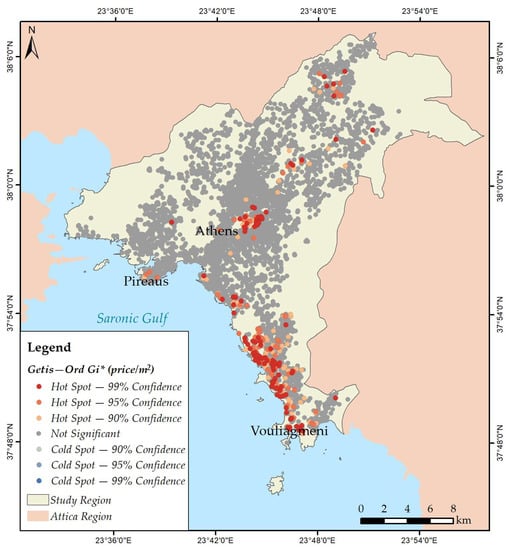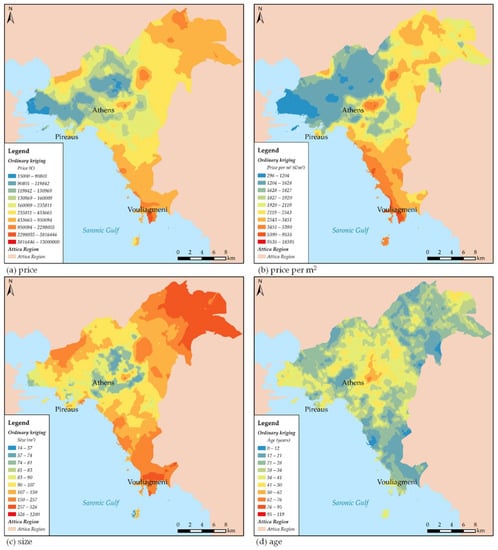 Therefore, two geovisualization methods, i.e., kriging analysis and hot-spot analysis produced similar results, indicating a quite clear spatial differentiation in the study region. The northern and southern suburbs are characterized by high house prices and larger properties, relatively new in age. In addition, some parts of the center of the city have high prices, although in general the houses are older and of smaller size. Finally, two municipal units, Psychiko and Filothei, are characterized by high prices and large properties. These findings are related to the socioeconomic characteristics in the study region []. In the center of the city, some of the most expensive areas in the study region are traditionally located in close proximity to the parliament and the central square of the city, named Syntagma Square. The northern suburbs are characterized by large properties and extended private or public green areas, which, for several decades, have been the residence of entrepreneurs and, in general, of higher status population groups. The southern suburbs are characterized by more recent growth and house prices are high due to the proximity to the sea and the construction of the new airport in the early 2000s. Psychiko and the neighboring Filothei have been built according to town plans characterized by a circular road pattern and the presence of green areas. Several embassies are located in Psychiko and the socioeconomic status of the residents is related to high house prices. The rest of the study region is in general characterized by lower prices, while the differences in size and age are not important.
