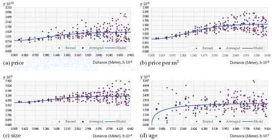 The results of the kriging analysis in Section 3.1 present the spatial patterns for four house characteristics: price, price per m2, size and age. For all these variables, the semivariograms model spatial autocorrelation, while the Moran’s I index (Figure 4) suggests quite strong spatial autocorrelation and a clustered spatial pattern. In addition, the diagnostics for ordinary kriging indicate a good fit of the model.