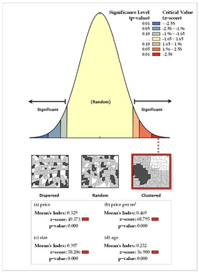 There are indices that measure spatial autocorrelation for s whole region, including all observations, such as the Moran’s I coefficient, and indices that can identify spatial clusters of observations with similar characteristics. These are the indices of local spatial autocorrelation, such as the local Moran’s I and the Getis–Ord Gi* coefficients. In this way, spatial clusters are identified, which are tested with inferential statistics and presented according to their statistical significance []. In this study, house characteristics are depicted using geostatistical techniques. Kriging analysis, in particular, is used in order to produce statistical surfaces for selected house characteristics. In order to measure spatial autocorrelation for these variables, the global Moran’s I indicator is calculated, while the Getis–Ord Gi* coefficient is used in order to identify spatial clusters.