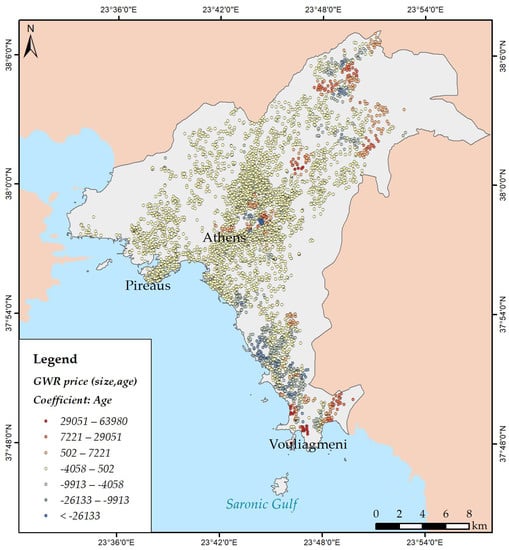 A very important advantage of GWR is that it creates local regression models and allows for the spatial variation of regression coefficients. The results produce regression coefficient surfaces and can lead to conclusions as to the importance of an explanatory factor in different parts of the study region. In Figure 9, the GWR regression coefficient for “size” is mapped, resulting to a quite clear spatial pattern. The smaller regression coefficients for size are observed mostly in the western parts of the study region, but also in several neighborhoods of Athens, where lower prices are prevailing (see Figure 2). On the contrary, larger regression coefficients are observed in the areas with high prices, especially Vouliagmeni, which is the most expensive region in Attica. In these areas, large sizes are accompanied by other amenities, such as the existence of a swimming pool. In Figure 10, the GWR regression coefficient for “age” is mapped. In most parts of the study region, negative coefficients for age are observed, as expected. The largest negative coefficients are observed in an expensive neighborhood at the center of Athens (Rigillis). On the other hand, positive coefficients for “age” are found in the expensive areas of the city, which were previously identified, although negative coefficients are observed there as well. For the interpretation of positive age coefficients specific knowledge for these houses is required, if, for example, they are houses of certain historical or architectural value.