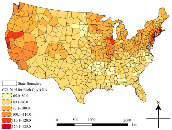 Previous studies have proven that cities with CCI values are spatially auto-correlated [15,16], meaning that it is valid to perform interpolation for locations that do not have CCI values. As mentioned in the previous section, three methods, including NN, CNN, and IDW were selected as the interpolation techniques for estimating CCI values for cities not currently included in the index database.