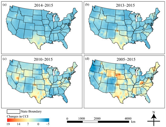 As mentioned in Section 2.2, the IDW interpolation method was selected as the most effective technique for interpolating and mapping construction costs at the national level. Figure 5 has been created to exhibit the overall pattern of construction costs from 2004 to 2015 using the IDW method [7,23,24,25,26,27,28,29,30,31,32,33]. All maps were projected into the U.S. Continuous Lambert Conformal Conic coordinate system. As shown in Figure 5, each year’s construction cost is presented as a smooth surface. The continuous surface fills the voids where no construction cost data exist. IDW interpolated surface maps are also produced in the raster format; therefore, they can be overlaid, meaning values from one map can be compared to another to produce cost change maps at the national level. Figure 6 shows the construction cost differences in one year, two years, five years, and ten years to reveal construction cost variations over the years.