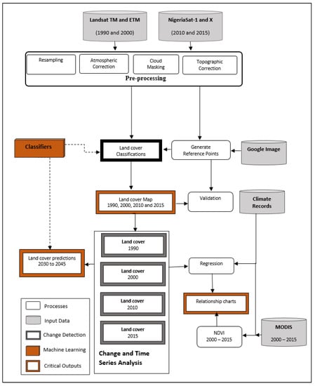 Landsat TM (1990) Path 186, Row 051 and Path 187, Row 052, Landsat ETM (2000) in GeoTIFF format of dry seasons were downloaded for free from the United States Geological Survey department via the link (earthexplorer.usgs, accessed on 8 March 2022). These imageries were mosaicked in Erdas Imagine version 9.3. NigeriaSat-1 (2010), and NigeriaSat-X (2015) satellite imageries were also used. NigeriaSat-1 (32 m) and NigeriaSat-X (22 m) data were resampled to 30m (Landsat data resolution) for spatial consistency and overlay purposes. Radiometric was carried out using the haze and noise reduction tools, while atmospheric and geometric corrections were carried out using the ATCOR-II model in Erdas Imagine version 9.3 so as to improve data quality. Both Landsat and NigeriaSat images were orthorectified, in GeoTIFF format and in geographic WGS 84 (EPSG 4326) but we projected to WGS 1984/UTM zone 32N–Minna Datum (EPSG 32632).